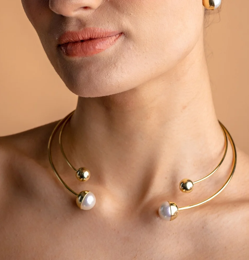 - Clássicas: aposte em pérolas ou colares de linhas retas para um contraste refinado.