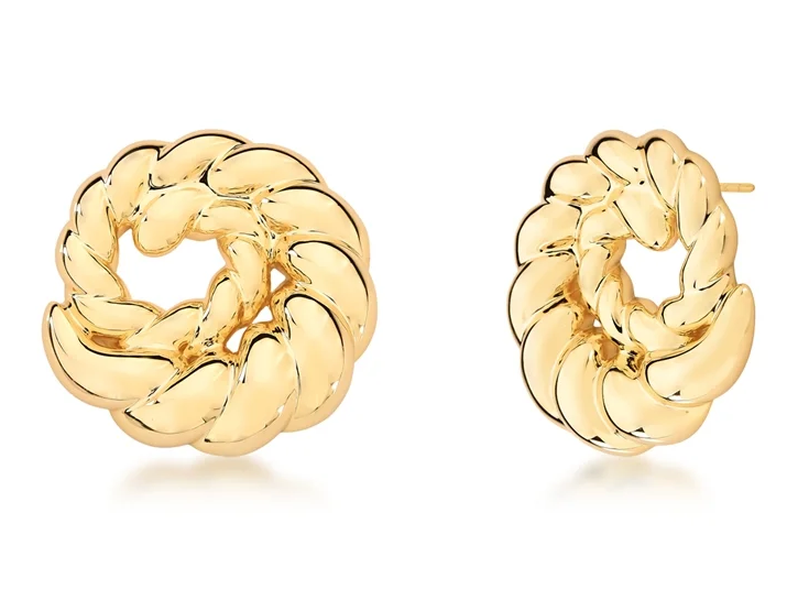 • Os pingentes geométricos criam contraste moderno em looks românticos.