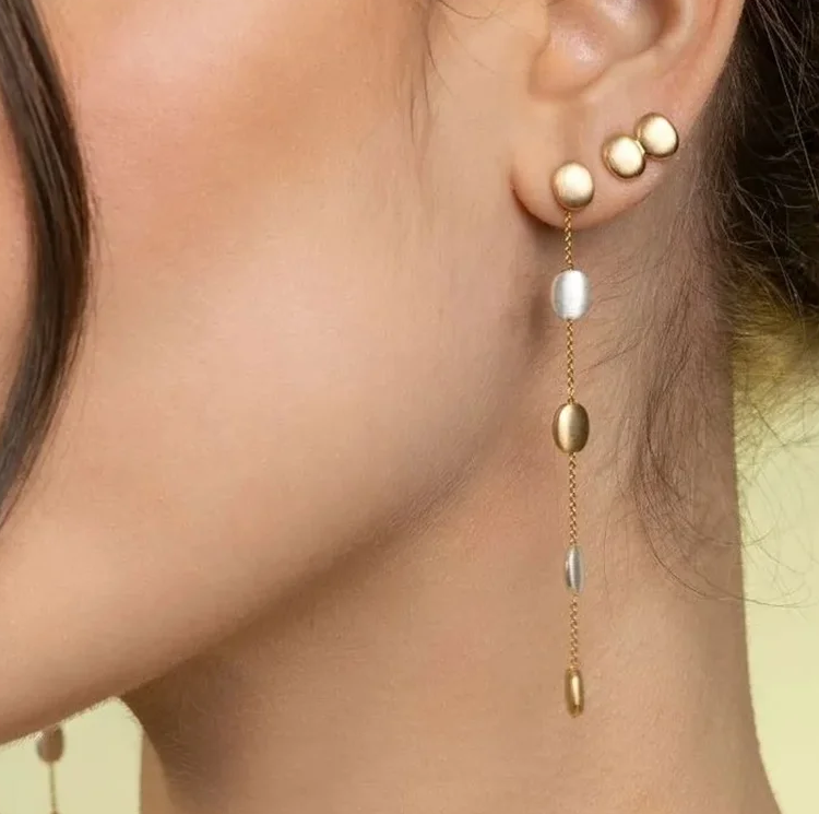 A mistura de metais voltou à moda e aparece forte nas composições. Dourado + prata no mesmo lado da orelha já é tendência mundial.
